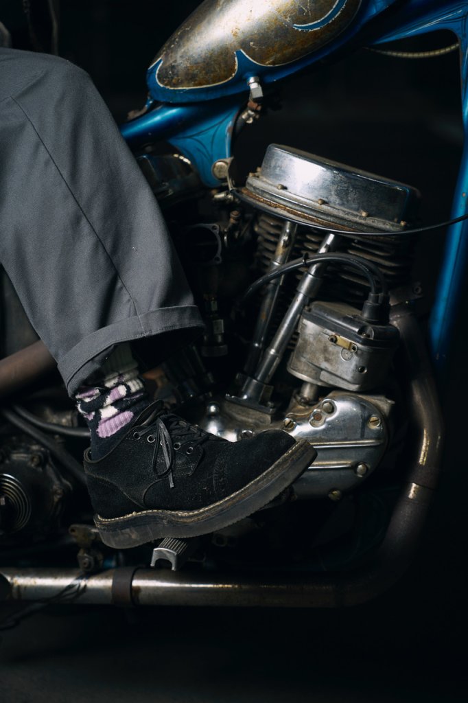 撮影の合間のちょっとした時間を縫って、人様の車両に跨ってパチリ。 Oxford Black ROはワークからカジュアル、ドレスまで様々な要素を合わせ持ち、如何なるシーンにも調和する万能選手だが、やはり旧車との相性は格別だ。 個人的にはどちらも心を寄せるモノゆえ一際強くそう感じるのだろうが、これに異を唱える人もいないだろう。 ROLLER magazine / KSKphoto: Kentaro Yamada